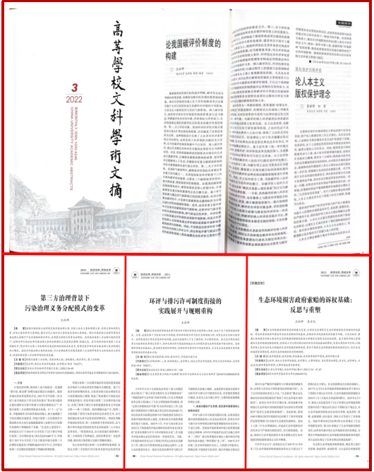 发表于《吉林大学社会科学学报》2020年第2期的论文《第三方治理背景下污染治理义务分配模式的变革》被人大报刊复印资料《经济法学劳动法学》2020年第6期全文转载;发表于《政法论丛》2020年第5期的论文《环评与排污许可制度衔接的实践展开与规则重构》被人大报刊复印资料《经济法学劳动法学》2021年第1期全文转载;发表于《江苏大学学报(社会科学版)》2021年第5期的论文《生态环境损害政府索赔的诉权基础:反思与重塑》被人大报刊复印资料《经济法学劳动法学》2022年第2期全文转载;发表于《北方法学》2022年第2期的论文《论我国碳评价制度的构建》被《高等学校文科学术文摘》2022年第3期转载。