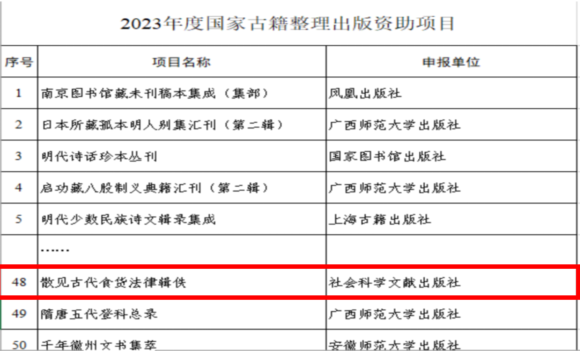 杨一凡先生主持的《散见古代食货法律辑佚》入选全国古籍出版资助项目