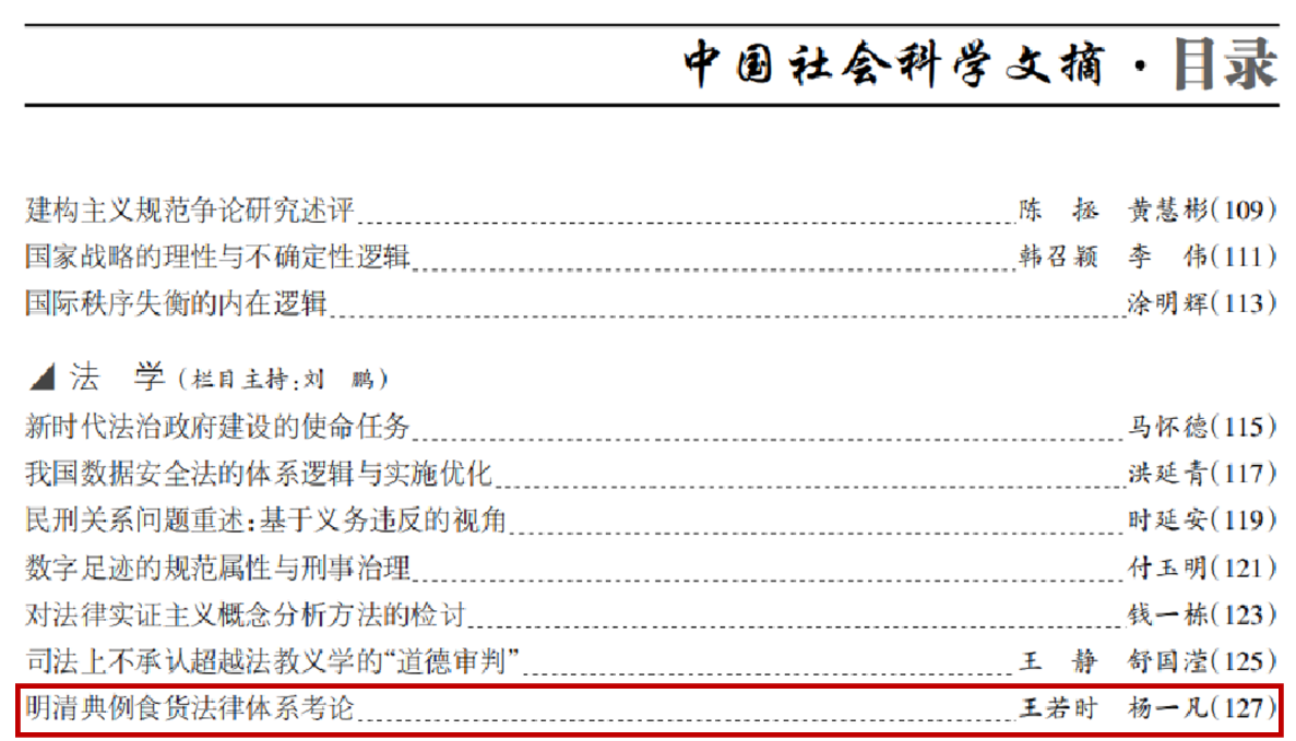 近日,我院王若时老师与杨一凡教授共同撰写的论文《明清典例食货法律体系考论》被《中国社会科学文摘》2023年第7期转载,该论文原发表于《广东社会科学》2023年第2期。
