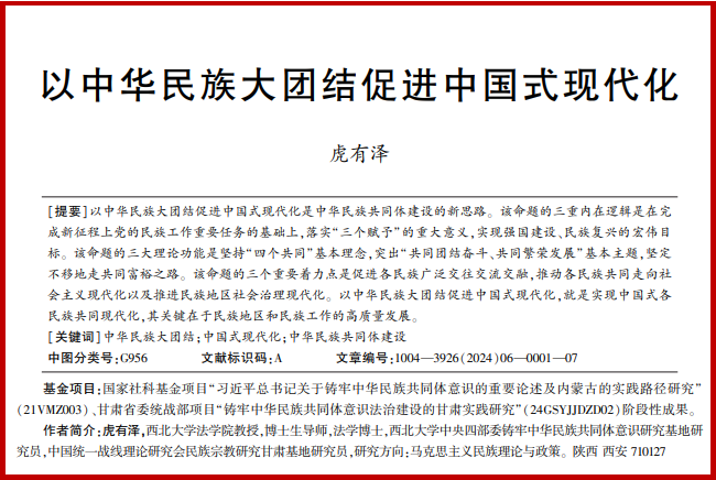 近日,学院虎有泽教授的论文以中华民族大团结促进中国式现代化CSSCI期刊《西南民族大学学报》》(人文社会科学版)2024年第6期发表。文章认为中华民族大团结促进中国式现代化是中华民族共同体建设的新思路。该命题的三重内在逻辑是在完成新征程上党的民族工作重要任务的基础上,落实三个赋予的重大意义,实现强国建设、民族复兴的宏伟目标。该命题的三大理论功能是坚持四个共同基本理念,突出共同团结奋斗、共同繁荣发展基本主题,坚定不移地走共同富裕之路。该命题的三个重要着力点是促进各民族广泛交往交流交融,推动各民族共同走向社会主义现代化以及推进民族地区社会治理现代化。 以中华民族大团结促进中国式现代化,就是实现中国式各民族共同现代化,其关键在于民族地区和民族工作的高质量发展。