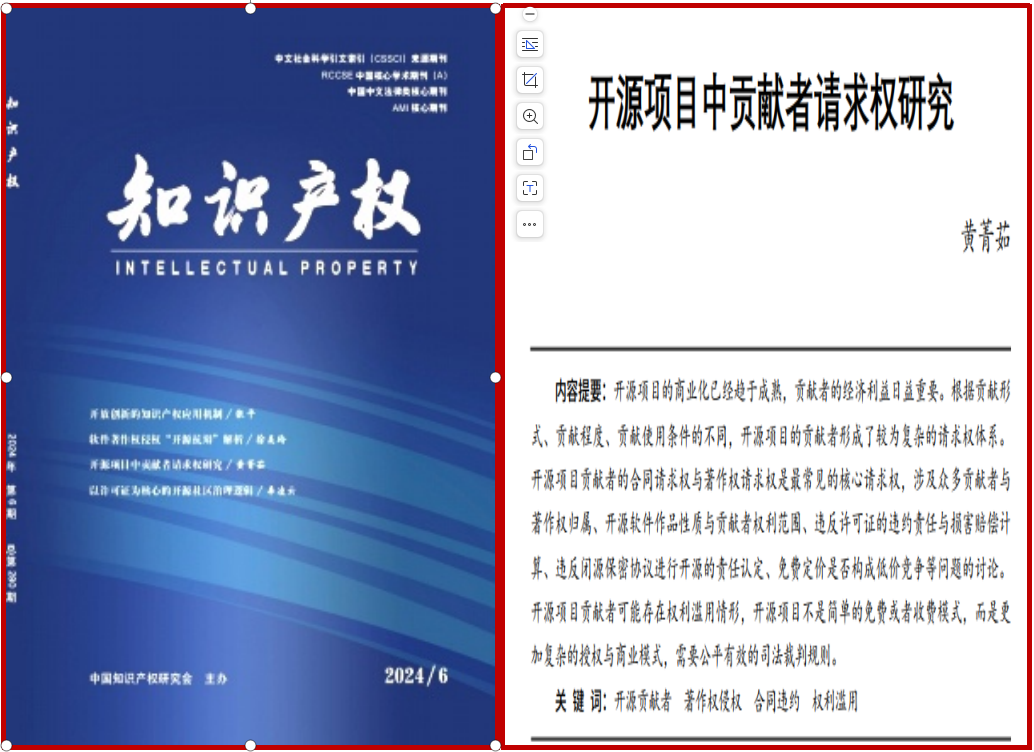 近日,学院教师黄菁茹博士的论文开源项目中贡献者请求权研究在法学类CSSCI期刊《知识产权2024年第6期发表。