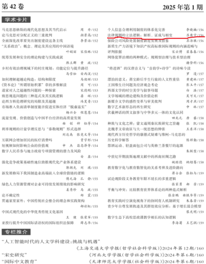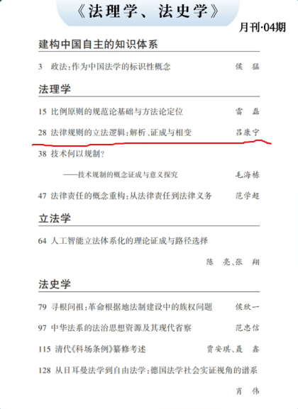 近日,我院吕康宁老师撰写的论文法律规则的立法逻辑:解析、证成与相变,被《人大复印资料·法理学法史学》2025年第4期全文转载、《高等学校文科学术文摘》2025年第1期学术卡片转摘。该文原发表在《暨南学报(哲学社会科学版)2024年第11期。