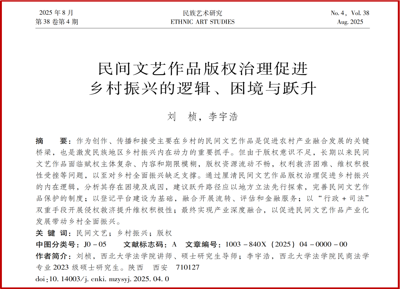 近日,学院青年教师刘桢在CSSCI来源期刊《民族艺术研究》2025年第4期发表了题为《民间文艺作品版权治理促进乡村振兴的逻辑、困境与跃升》的论文。