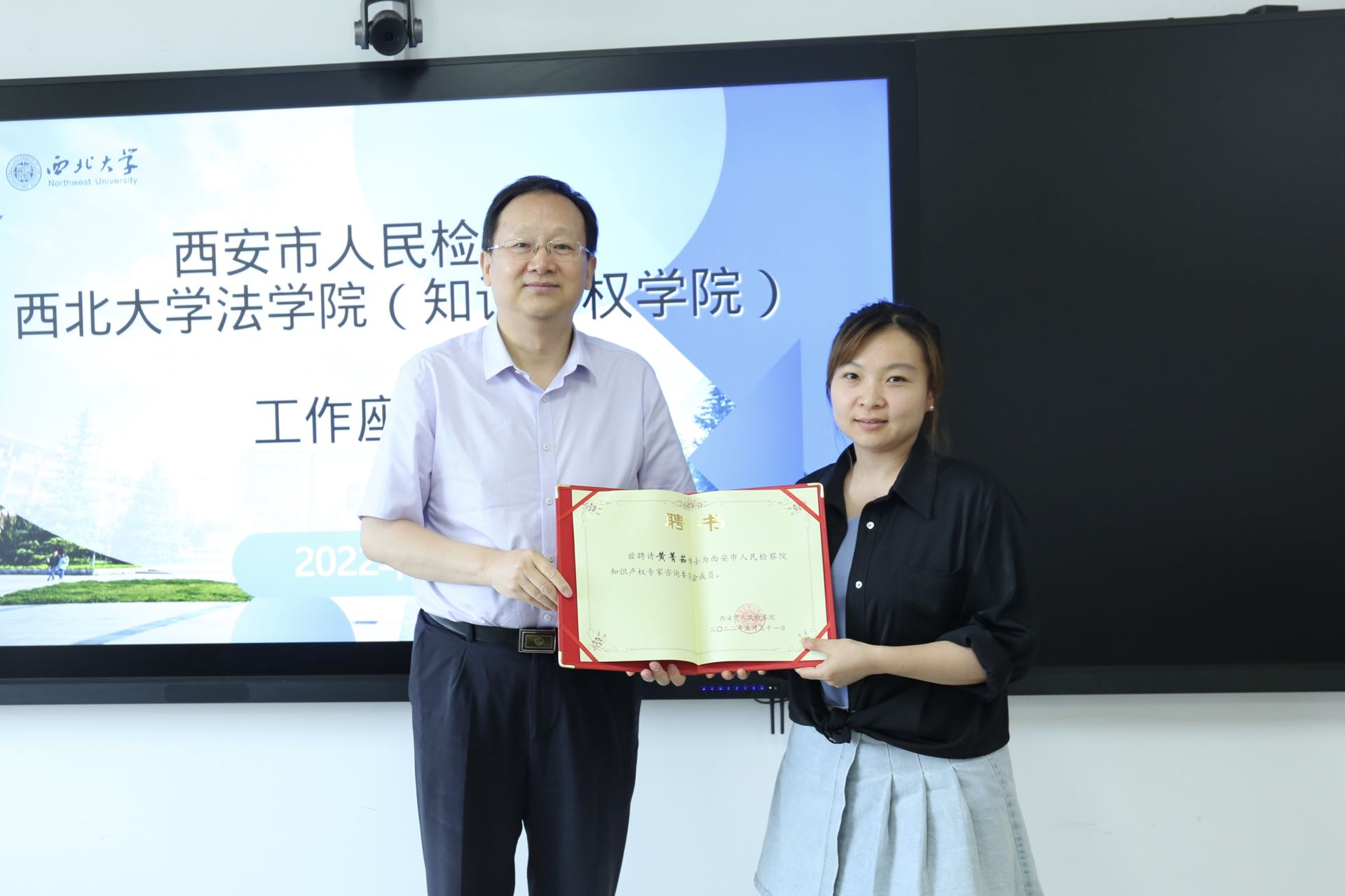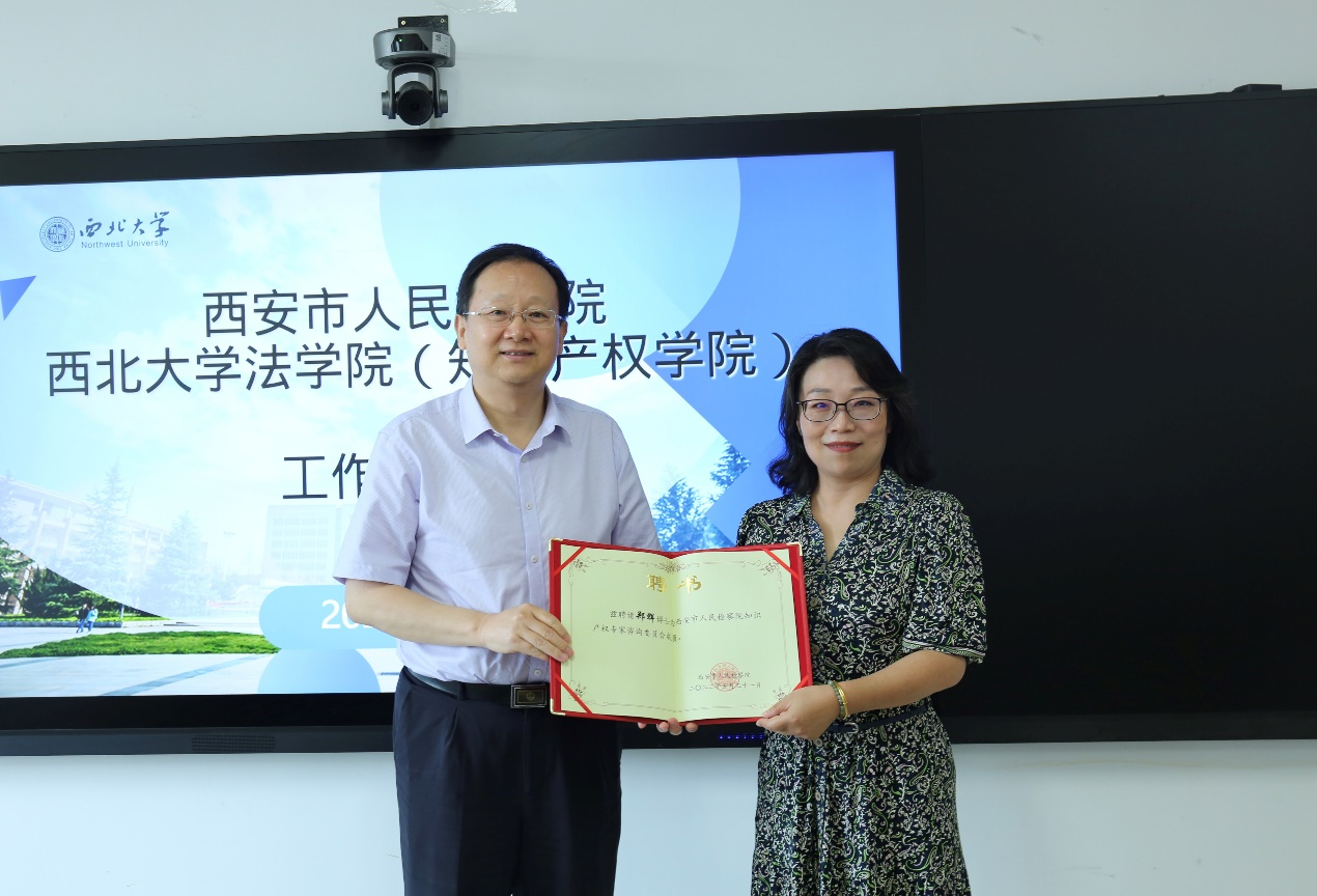 随后,施文平副检察长代表西安市人民检察院向郑辉副教授、黄菁茹博士颁发了西安市人民检察院知识产权专家咨询委员会特邀专家聘书。双方还就订单式人才培养、学生实践实习、学生就业等工作展开深入交流,希望今后继续提升合作层次、深化合作内容、拓展合作领域,实现优势互补,进一步加强人才供需对接,努力实现毕业生的高质量就业。