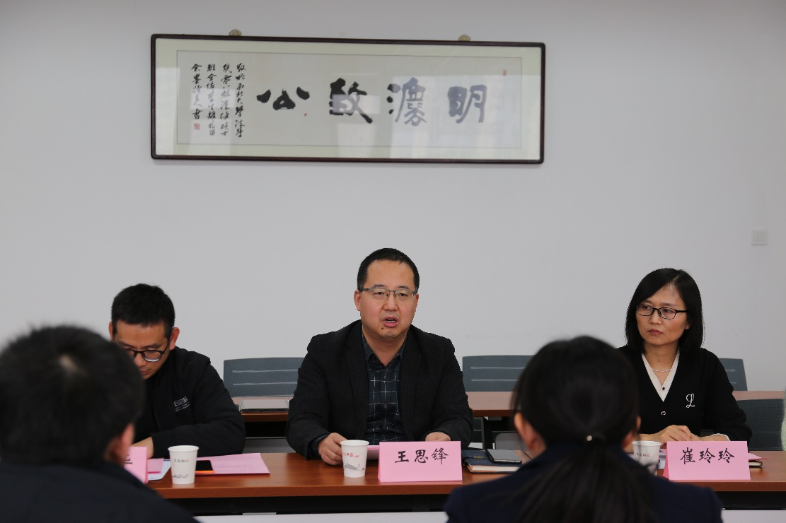 王思锋院长首先对史丽妮副院长一行五人莅临我院交流工作表示欢迎。随后,他介绍了我院的发展历史、师资力量、人才培养制度、学科建设、科学研究以及特色研究方向等情况,尤其详细介绍了我院知识产权专业的建设情况。他提到,目前我院正在不断推进法学教育模式和法治人才培养机制改革,积极与实务部门深入合作,探索协同育人机制,通过课程共建、专业共建、师资共建、队伍共建等,实现校地融合发展,提升人才培养质量。最后,王思锋院长对史丽妮副院长一行莅临我院交流工作再次表示感谢,并希望双方今后在法治人才培养、实践教学以及重点在知识产权保护等领域加强合作,立足新需求、迎接新挑战,共同推进法学理论与实践的融合发展。